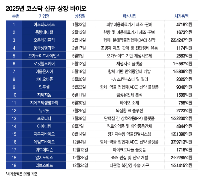 올해 코스닥 신규 상장 바이오 19개사 중 8개사 조단위 시총 형성…코스피 상장도 3개사