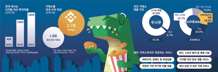이는 해외 거래소를 이용하는 한국 투자자가 폭발적으로 늘어나고 있기 때문이다.실제로 올 들어 9월까지 한국 투자자들은 해외 거래소에서 124조원 규모의 디지털 자산을 사들였다.올해 전체로는 160조원에 달할 것이라고 타이거리서치는 전망했다.2년 전인 2023년(45조5000억원)과 비교하면 3배 수준이다.