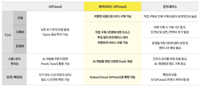 이 모델을 적용할 경우 퍼블릭 클라우드 GPUaaS 대비 약 33% 수준의 TCO 절감 효과를 기대할 수 있고 고객이 직접 온프레미스를 구축하는 방식과 비교해도 약 10~20% 비용 효율성이 개선된다는 것이 카카오엔터프라이즈의 분석이다.