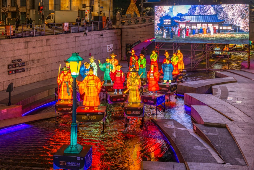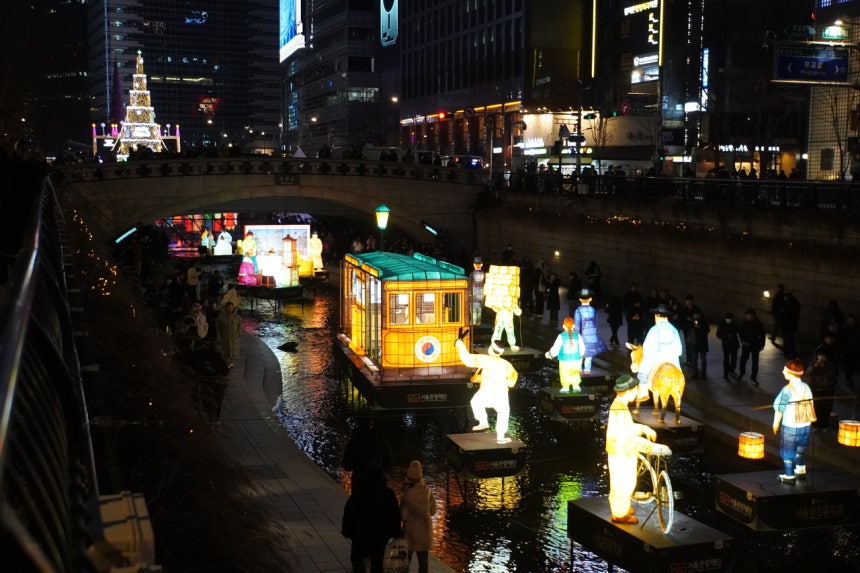 열기구 모양으로 떠오르는 서울의 마래를 형상화한 등불에 이어 케데헌 라면 브랜드의 조형물을 지나면 대만관광청과 체코관광청이 청계2~3가 사이 개천안에 나란히 이들 나라 고유의 상징을 등으로 만들어 세웠다.