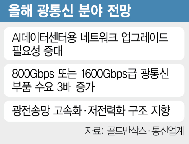골드만삭스는 보고서에서 “올해 AI 성장세에 따라 800Gbps 또는 1600Gbps급 광통신 부품 수요가 전년 대비 3배 이상 급증할 것”이라며 “AI 서버 및 광통신 산업이 조달러 규모의 시장으로 커질 것”이라고 전망했다.현재 5세대(5G) 통신망에서 가장 보편적인 데이터 처리 속도는 400Gbps인데 AI 데이터센터에 연결하기 위해 2배 이상 빠른 전송망이 확충될 것이란 얘기다.AI 인프라에 요구되는 초고속·초지연 네트워크 환경을 구현하기 위해서는 광통신이 필수라는 분석이다.