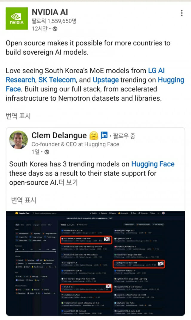 해당 게시물은 클렘 들랑그 허깅페이스 공동창업자 겸 최고경영자(CEO)가 올린 글을 리포스팅한 형태다.들랑그 CEO는 지난 8일 "한국 모델 3개가 허깅페이스에서 트렌딩 모델로 올랐다"고 언급했다.