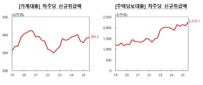 한국은행이 22일 발표한‘차주별 가계부채 통계 편제 결과’에 따르면 2025년 3분기 차주당 가계대출 신규취급액은 평균 3852만원으로 전 분기보다 26만원 증가했다.감소세를 보이던 가계대출 신규취급액이 2분기부터 다시 늘어나며 완만한 증가 흐름을 이어간 것이다.이 가운데 주담대 신규취급액은 2억 2707만원으로,전 분기 대비 1712만원 급증했다.
