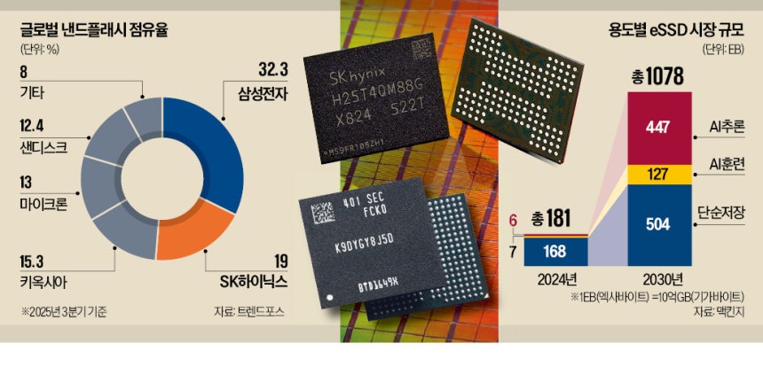 맥킨지컨설팅에 따르면 기업용 SSD 시장 규모는 2024년 181EB(엑사바이트·1EB는 10억GB)에서 2030년 1078EB로 여섯 배 커질 것으로 전망된다.이 중 AI 추론용 규모가 447EB로 41%를 차지한다.업계 관계자는 “구조적 수요 증가로 공급 부족이 더욱 심화할 가능성이 높다”고 설명했다.