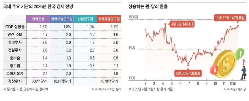 실제 한은은 2025년 12월 17일‘물가 안정 목표 운영 상황 점검’설명회에서 2026년 소비자물가 상승률 전망치를 2.1%로 상향했다.앞선 11월 27일 경제 전망 발표 때 제시했던 2.0% 전망치를 20일 만에 조정한 것이다.그러면서 최근의 달러당 1470원대 원화 환율이 상당 기간 지속하면 내년 소비자물가 상승률이 2.3%까지 오를 수 있다고 우려했다.한 금융회사 이코노미스트는 “한은이 불과 20일 만에 소비자물가 상승률 전망치를 상향한 것은 최근 환율 상승이 쉽게 안정될 수 있는 상황이 아니라는 점을 인정한 것”이라면서 “원화 약세 속도와 폭이 새해 경기회복의 최대 변수가 되고 있다”고 했다.