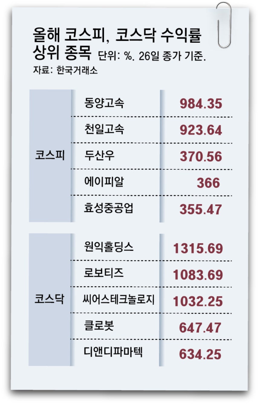 올 연말을 화려하게 장식한 테마는 로봇이었다.코스닥 수익률 상위권에는 원익홀딩스(1315.69%),로보티즈(1083.69%),클로봇(647.47%) 등 로봇기업이 이름을 올렸다.원익홀딩스는 올해 들어 26일까지 국내 증시에서 가장 많이 오른 종목으로 꼽혔다.