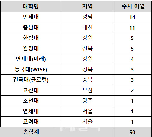 실제로 지방 소재 의대에서는 48명의 미충원이 발생했다.서울 소재 의대는 2명에 그쳤다.대학별 수시 미충원 인원은 △인제대 14명 △충남대 11명 △한림대 5명 △원광대 5명 △연세대(미래) 4명 △동국대(WISE) 3명 △건국대(글로컬) 3명 △고신대 2명 △조선대·연세대·고려대 각 1명이다.
