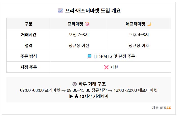 노동계와 증권업계의 우려를 반영한 보완책도 함께 제시했다.거래소는 프리·애프터마켓에서 지점 주문을 금지하고 본점 및 홈트레이딩서비스(HTS)·모바일트레이딩서비스(MTS) 주문만 허용해 노무 부담을 최소화할 방침이다.