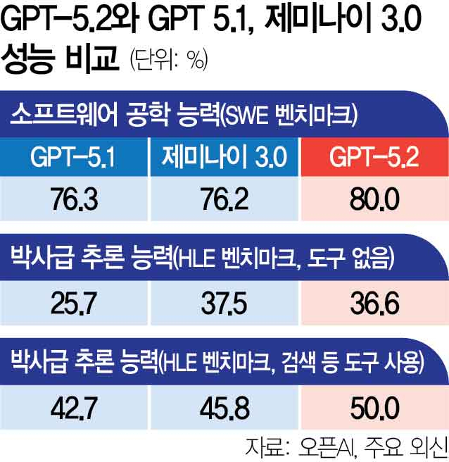 구글도 같은 날 제미나이 3.0 프로의‘심층 연구’에이전트를 선보이며 맞불을 놓았다.구글은 이번 새 에이전트가‘심층검색QA’벤치마크 도구로 측정한 결과에서 66.1%의 점수를 받아 최고 성능을 보였다고 주장했다.구글은 또 HLE 벤치마크에서도 심층 연구 에이전트가 46.4%를 기록했다고 덧붙였다.한동안 챗GPT 독주 체제에 가까웠던 AI 모델 시장에서 구글이 치고 나오면서 경쟁이 점차 격화하고 있는 모양새다.오픈AI가 불과 한 달 간격으로 챗GPT 새 버전을 내놓은 것은 2022년 챗GPT 서비스를 시작한 이래 처음 있는 일이고 구글이 GPT-5.2 출시 당일에 새 에이전트를 공개한 것도 이례적인 일로 평가된다.오픈AI는 당초 GPT-5.2를 이달 말께 내놓으려 했지만 제미나이 3.0 프로가 강력한 벤치마크 성적표를 앞세워 이용자 몰이를 하는 것을 보고 출시를 앞당긴 것으로 전해졌다.앞서 샘 올트먼 오픈AI 최고경영자(CEO)는 제미나이 3.0 프로 출시 직후인 이달 1일 사내에‘적색 경보(코드 레드)’를 발령하고 내년 1월 또 다른 새 모델을 선보인 뒤에야 이를 해제하겠다고 예고했다.
