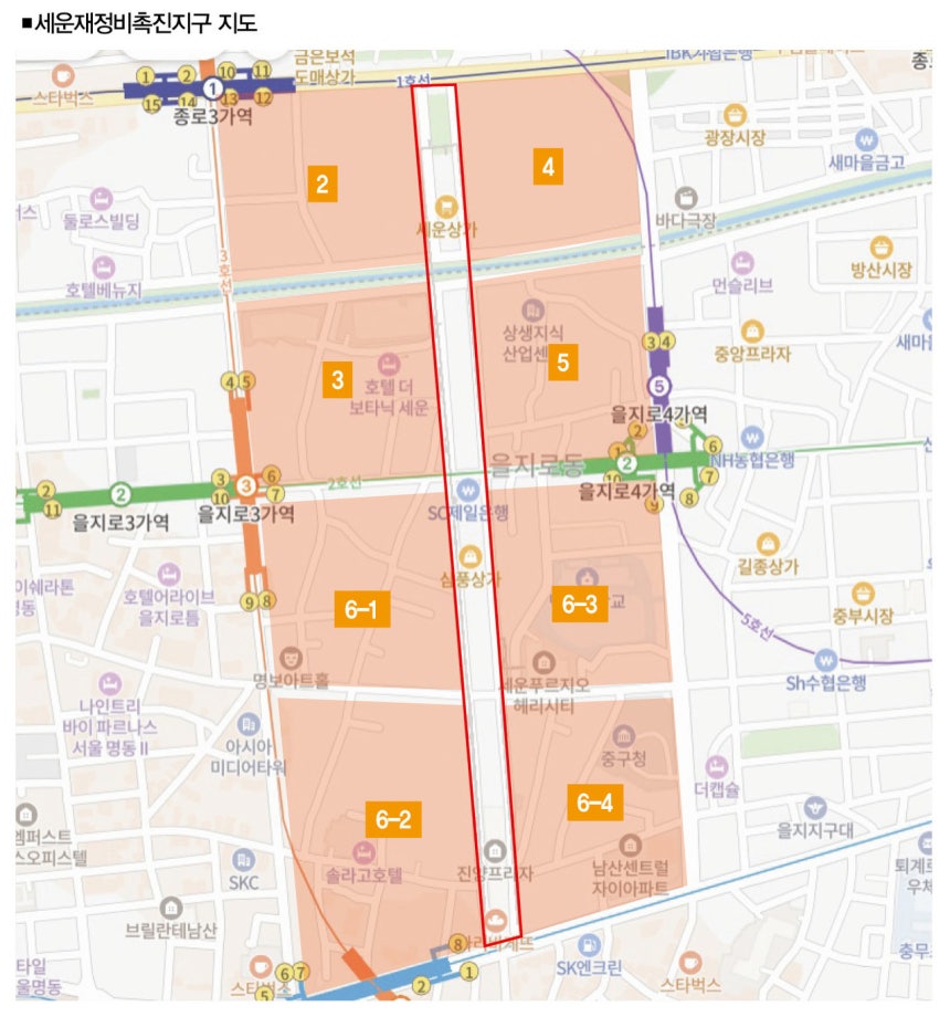 좀 더 구체적으로 설명해보자(지도 참조).서울시는 종로구 세운상가에서 시작해 진양상가로 이어지는 건물의 양옆 땅을 개발 대상지로 선정했다.1㎞가량 이어지는 상가 건물을 철거하고 남산으로 이어지는 녹지를 확보하겠다는 게 개발의 골자인데,새 건물은 원래 상가가 있었던 양쪽 땅에서 건설된다.'도시형 소공업'은 새 건물이 들어설 구역에 있는 1층 건물에서 이뤄진다.서울시의 계획대로라면 도시형 공장은 둥지를 옮겨야 한다.