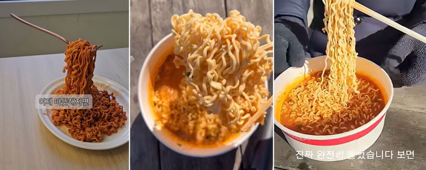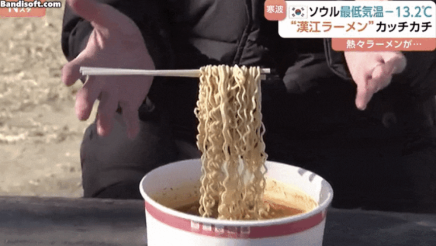 전국적으로 체감온도 영하 20도 안팎의 강한 추위가 몰아친 가운데,일본의 한 기자가 추위에 꽁꽁 언‘한강 라면’을 손으로 뜯어 먹는 체험기를 올려 화제다.최근 인터넷상에서‘라면 얼리기 챌린지’가 인기를 끌면서 해외 네티즌 사이에서도 관심을 끌고 있다.