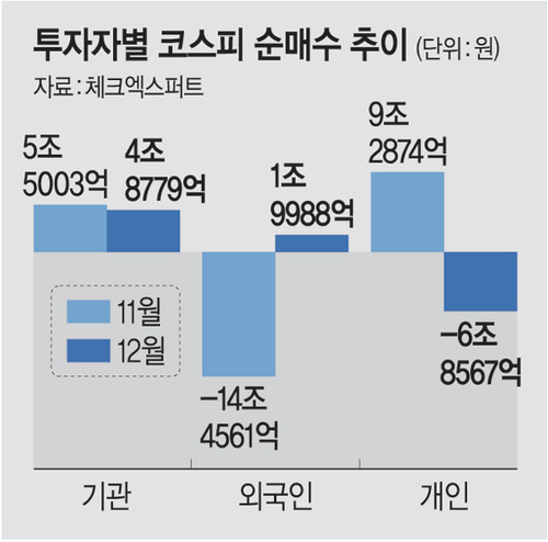이 같은 흐름은 12월 들어 뚜렷해진 수급 변화와 맞닿아 있다.체크엑스퍼트에 따르면 이달 들어 코스피 시장에서 기관투자자는 4조8779억 원(전일 기준),외국인은 1조9988억 원을 각각 순매수했다.반면 개인투자자는 6조8567억 원을 순매도했다.이는 11월 외국인이 14조4561억 원을 순매도하고 개인이 9조2874억 원을 순매수했던 흐름과는 뚜렷이 대비된다.