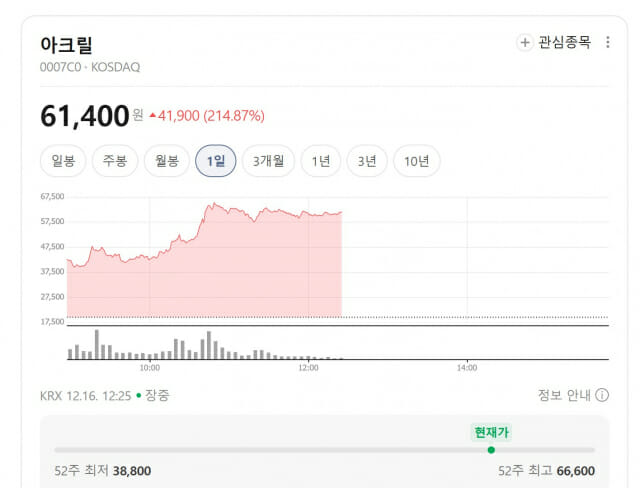 박외진 대표 "14년간 AX 솔루션 기술 다져.투명 경영·지속적 혁신으로 주주 가치 제고"국내 인공지능 전환(AX) 인프라전문 기업 아크릴(대표 박외진)이 16일 코스닥 시장에 상장했다.상장 첫날부터 공모가 대비 3배 넘게 급등하며 강세를 보였다.이날 한국거래소에 따르면 오전 9시 10분 기준 아크릴은 공모가(1만9500원) 대비 105.90%(2만650원) 오른 4만150원에 거래됐고,장중 한때 6만6600원까지 치솟았다.