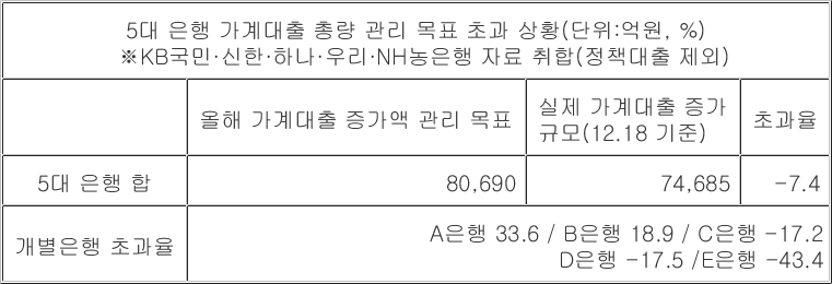 5개 은행 가운데 2개 은행만 자체 개별 목표를 초과한 상태다.초과율은 A 은행이 33.6%,B 은행은 18.9% 수준이다.나머지 3개 은행은 각 목표보다 43.4%,17.2%,17.5% 적어 총량 관리에 성공했다.