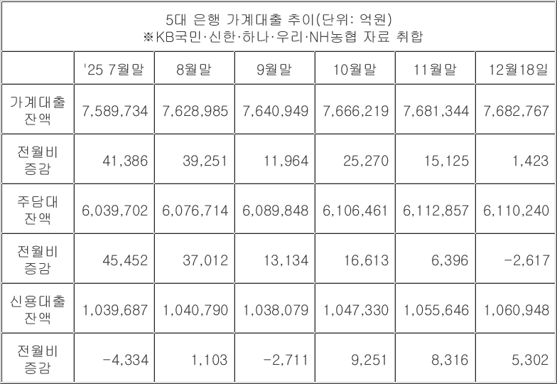 반대로 신용대출은 이달 들어서만 이미 5천302억원(105조5천646억원→106조948억원) 더 늘었다.일평균 증가 속도(+294억원)도 11월(+277억원)보다 빠르다.