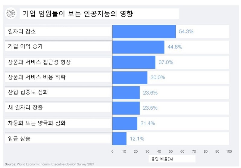 별도로 전 세계 기업 임원 1만여명을 대상으로 실시한 설문조사에서도 일자리 감축 전망이 우세했다.임원의 절반 이상(54%)이 기존 일자리가 사라질 것으로 예상했다.새로운 일자리 창출에 더 점수를 준 임원들은 24%였다.