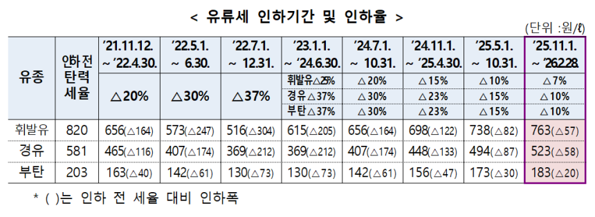 이에 따라 수송용 유류에 대한 유류세 한시적 인하는 내년 2월28일까지 2개월 연장된다.현행과 동일하게 휘발유 7%,경유와 액화석유가스(LPG) 부탄 10% 인하가 적용된다.