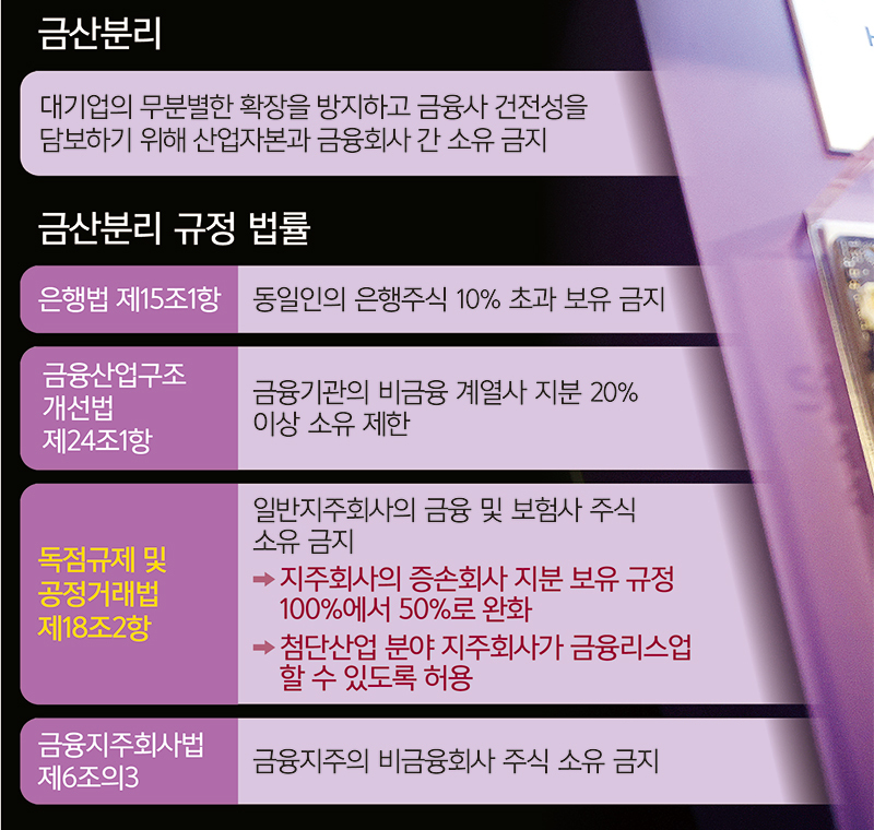 ‘독점규제 및 공정거래에 관한 법률’(공정거래법)은 금융지주회사가 금융업이나 보험업을 하지 않는 국내 회사의 주식을 소유하는 것과 일반지주회사가 금융업 혹은 보험업을 영위하는 국내 회사의 주식을 보유하는 것을 금지하는 금산분리 원칙을 두고 있다.하지만 이번 정부의 결정으로 반도체 등 대규모 설비 투자가 필수적인 업종에 대해서는 지주회사가 리스(대여) 형태의 금융업을 통해 계열사에 설비를 공급할 수 있도록 길이 열리게 됐다.