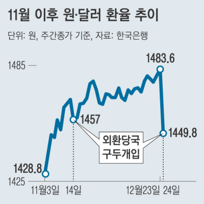 외환당국의 고강도 구두개입에 더해 서학개미(해외주식 투자자)의 국내 복귀를 유도하는‘고강도 수급대책’이 24일 나오자 1480원대였던 원·달러 환율이 단숨에 1450원 아래로 내려왔다.