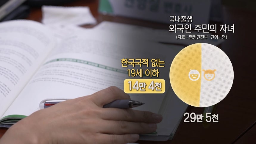 한국에서 태어난 외국인 주민의 자녀는 29만 5천 명.이 가운데 한국 국적이 없는 아이는 14만 4천 명이 넘습니다.집계 안 된 아이들까지 포함하면 30만 명 정도로 추산됩니다.