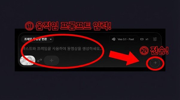 이미지가 등록되면 입력창 왼쪽에 썸네일이 보인다.이제‘텍스트와 프레임을 사용하여 동영상을 생성하세요’라고 쓰인 곳에 동영상 프롬프트를 입력한다.그리고 전송 버튼을 누른 후 기다리면,동영상이 생성된다.