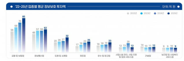 업종별 평균 투자액은 금융 및 보험업(85억원),정보통신업(62억원),도매 및 소매업(32억원) 순으로 높았다.또 사업시설 관리,사업 지원 및 임대 서비스업,보건업 및 사회복지 서비스업은 평균 정보보호 투자액이 전년 대비 감소했다.