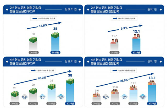 실제,4년 연속 공시 기업의 평균 정보보호 투자액 증가율은 48.3%,2년 연속 기업은 13.8%로 나타났고,정보보호 전담인력 증가율도 4년 연속 공시 기업은 평균 36.6%,2년 연속 기업은 9.9%였다.