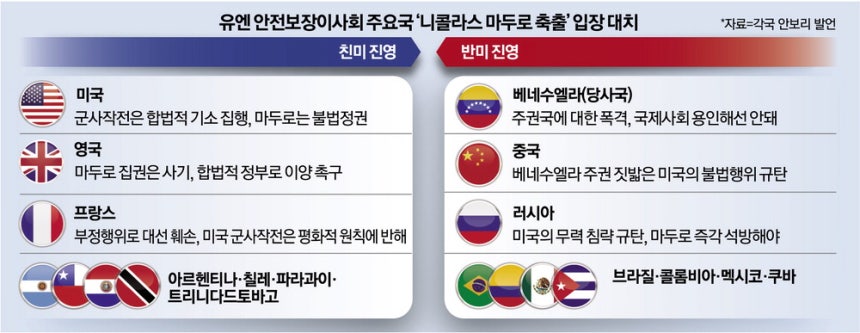 5일(현지시간) 뉴욕 유엔본부에서 열린 유엔 안전보장이사회(안보리) 긴급회의에선 미국의 마두로 전 대통령 체포에 대해 안보리 상임이사국인 미국·영국·프랑스와 중국·러시아 간 극명한 입장차가 드러났다.
