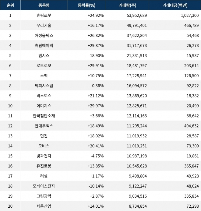 해성옵틱스(076610)는 1480원의 현재가로 3762만 2804주가 거래되며 3위에 올랐다.등락률은 26.82%의 급등세를 보이고 있다.휴림에이텍(078590)은 887원의 현재가로 3171만 7673주가 거래되며 29.87%의 급등을 기록하고 있다.캠시스(050110)는 708원의 현재가로 2133만 1913주가 거래되며 등락률 -18.90%를 보이고 있다.로보로보(215100)는 상한가에 근접한 29.91% 상승률을 기록하며 1만 8481만 797주가 거래되고 있다.스맥(099440)은 7210원의 현재가로 1722만 8941주가 거래되며 10.75% 상승을 보인다.씨피시스템(413630)은 5610원의 현재가로 1609만 4572주가 거래되며 등락률 -0.36%를 보인다.비스토스(419540)는 1296원의 현재가로 1386만 9620주가 거래되며 21.12%의 상승세를 나타낸다.이미지스(115610)는 1700원의 현재가로 1282만 5671주가 거래되며 29.97%의 상한가를 기록하고 있다.