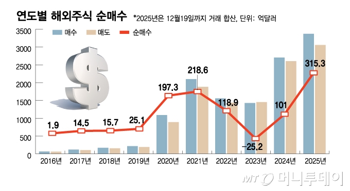 해외주식 거래 규모 자체도 커졌다.주식 기준 연간 매수·매도 합계는 2015년 약 140억달러에 불과했지만 올해는 6400억달러를 넘어섰다.10년 만에 시장 체급이 40배 넘게 커진 셈이다.
