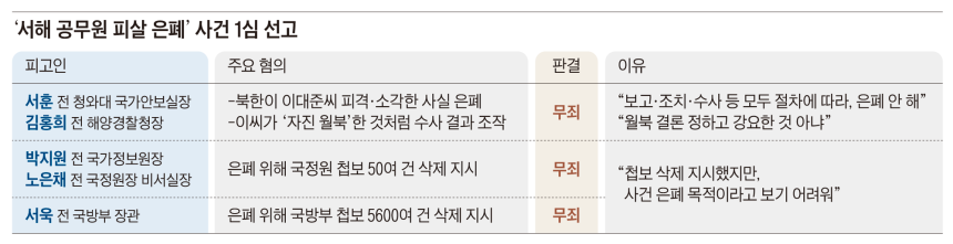 그러나 재판부는 이 같은 사실과 정황을 모두 인정하면서도 “검찰이 제출한 증거만으로는 형사처벌을 할 수 있을 정도로 혐의가 입증된다고 볼 수 없다”고 했다.문재인 정부 안보 라인 관계자들이 사건을 일부러 은폐·조작했다는 증거가 없다고 본 것이다.