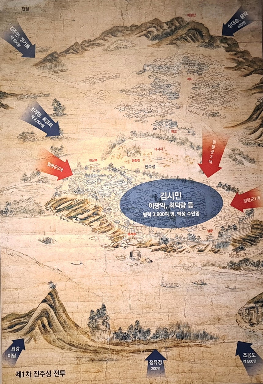 남강 북안의 돌출 지형 위에 세워진 진주성은 천혜의 성곽이다.비록 무기와 병력이 열세라 할지라도,단단한 진주성에 의지하고 군사를 효율적으로 운용한다면 충분히 싸울만한 전투였다.그게 아니어도 목숨을 걸고 배수진으로 맞서야 했다.그게 의(義)고 백성을 지키는 충(忠)이다.