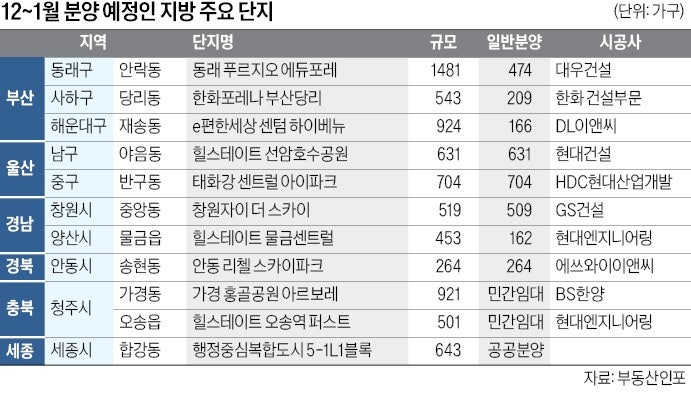 23일 업계에 따르면 이달 말부터 다음달까지 지방에서 11개 단지,7584가구가 분양할 예정이다.이 가운데 3119가구가 일반분양으로 풀린다.부산·울산·경남이 7개 단지 5255가구(일반분양 2855가구)로 가장 많다.