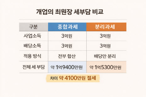그러나 배당소득을 종합과세에서 제외하고 분리과세를 적용하면 과세 구조가 달라진다.배당소득이 빠지면서 종합과세 대상은 사업소득 3억원만 남고,누진세율을 적용한 실효세율은 약 31% 수준으로 낮아진다.이에 따른 종합소득세는 약 9400만원이다.