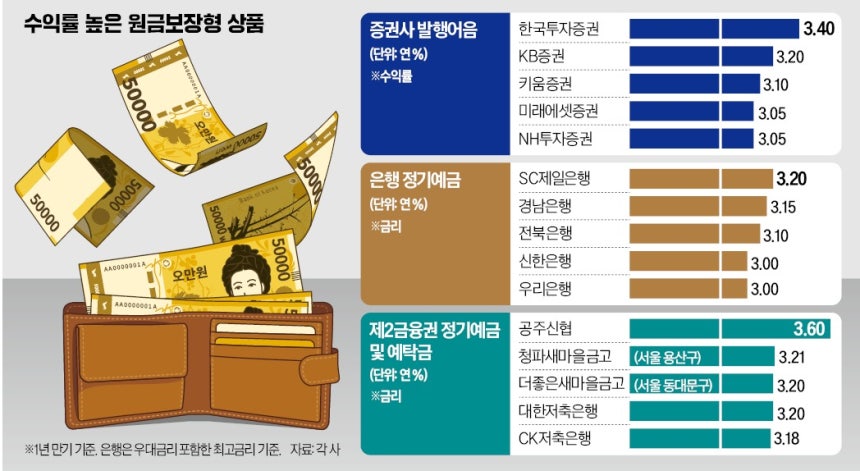 이자소득세 면제 받아수익률이 연 4%인 증권사 종합투자계좌(IMA) 상품이 등장하면서 고수익 원금보장형 상품에 대한 관심이 커지고 있다.시장금리가 거듭 오르면서 증권사뿐 아니라 시중은행에서도 금리 연 3% 이상 수신상품을 발견하는 게 어렵지 않다.연말 성과급으로 생긴 목돈을 안전하게 굴릴 만한 상품을 찾는 사람들의 선택 범위가 넓어지는 분위기다.전문가들은 비과세 혜택까지 노린다면 농·수·신협 및 새마을금고 등 상호금융을 이용하거나 개인 연금계좌를 통해 예금에 가입하는 방법을 고려해볼 만하다고 조언한다.