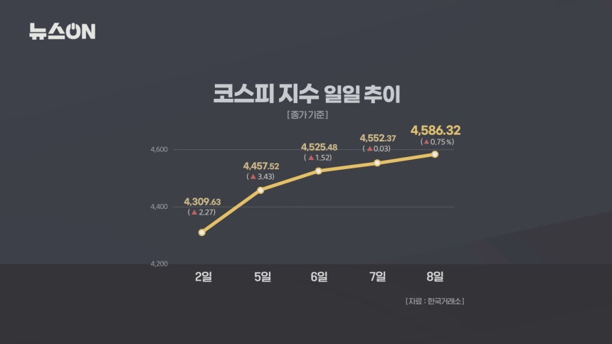 종가 기준으로 코스피 지수는 새해 첫 거래일인 1월 2일에 4300,2거래일이었던 1월 5일에 4400,1월 6일에 4500을 돌파하는 등 사상 최고를 경신했습니다.코스피 시가총액 합계가 처음으로 3천700조 원을 넘었고요.삼성전자와 SK하이닉스 두 반도체 대장주는 사상 최고가를 경신했습니다.코스닥도 52주 연속 신고가를 경신했습니다.