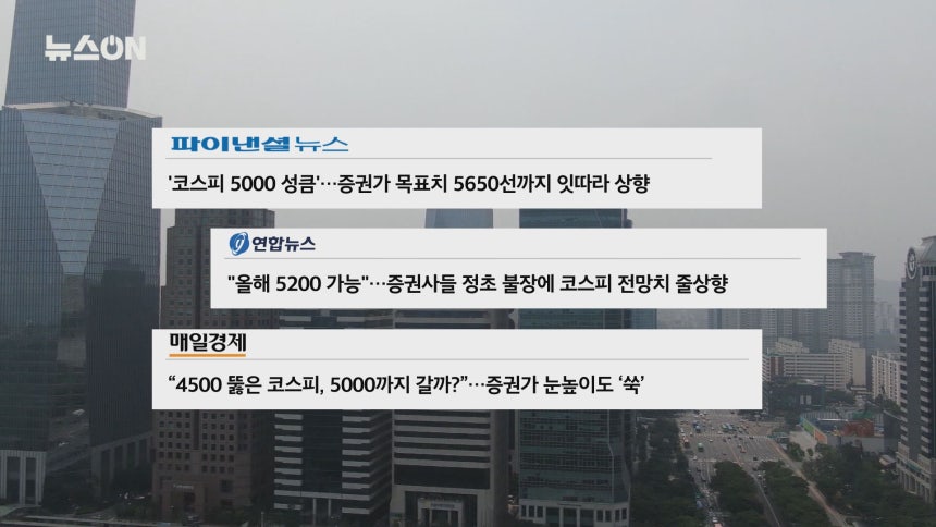 이재명 대통령이 코스피 5000시대를 열겠다고 했을 때 그렇게 하겠다는 게 아니라 그런 방향으로 가겠다는 선언적이라고 느끼기도 했는데,지금 흐름을 보면 코스피 5000이 1분기 내에 가능할 것이란 그런 전망을 할 수도 있을 것 같다는 전망이 나오고 있습니다.증권가는 코스피 상승세가 최소 상반기까지는 이어질 것으로 전망하고 있는데요.증권사마다 좀 다르지만,상단 4,500~5,500 하단은 3,500~4,000으로 전망했습니다.