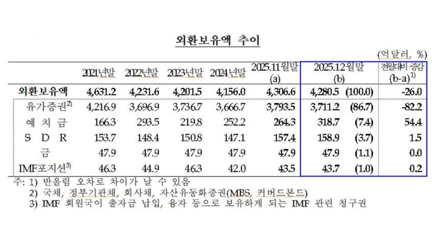 오늘(6일) 한국은행에 따르면 작년 12월 말 기준 우리나라 외환 보유액은 4천280억 5천만 달러(약 618조 원)로,전월보다 26억 달러 감소했습니다.