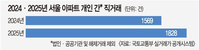 이런 상승세 속에서 지난해 공인중개사 없이 개인 간 직거래된 아파트도 증가했다.이날 국토교통부 실거래가 공개시스템에 따르면 지난해 직거래된 서울 아파트는 1828건(법인·공공기관 매수 및 해제거래 제외)으로 집계됐다.2024년(1569건)보다 16.5% 증가한 수치다.