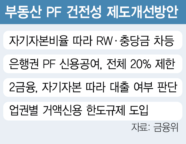 이번 개선안은 과도한 차입을 통해 PF 사업을 하는 것을 막는 게 목적이다.우선 2027년부터 PF 사업비 대비 자기자본비율 20%를 기준으로 위험가중치(RW)가 차등 적용된다.은행의 경우 현재 150% 적용이 원칙인 PF 대출에 대한 RW가 자기자본비율·분양률 기준 충족 여부에 따라 최대 100%까지 낮아진다.