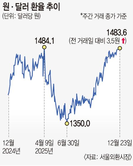 23일 서울 외환시장에서 달러 대비 원화는 전날보다 3.5원 오른 1483.6원으로 주간 거래를 마쳤다.장중 환율이 1463.7원까지 내렸던 지난 3일과 비교하면 3주 사이 20원 가까운 상승 폭을 기록했다.