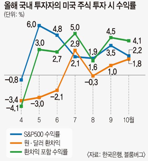 개인들의 대미 투자 선호 경향도 꺾이지 않고 있다.한은이 이날 발표한 금융안정 보고서에 따르면 개인투자자는 지난 7~10월 국내 주식을 23조원 순매도하면서 미국 증시가 중심인 해외 주식은 103억 달러(약 15조2800억원) 순매입했다.해당 기간 한·미 증시가 모두 상승세를 보였고,카지노 추천 뱅크 카지노특히 코스피 증시가 9~10월 28.9%나 올랐음에도 투자자들의‘장기적 신뢰’는 미국 증시로 향한 셈이다.