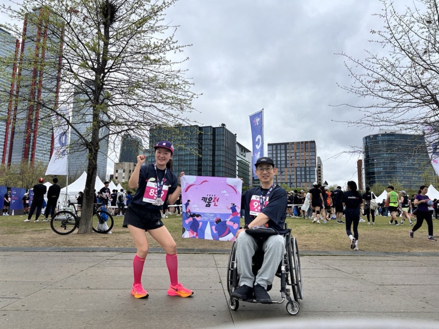 키움런이 좋았던 건 '같이러너'라는 제도가 있어서 기본적으로 모두가 함께 달릴 수 있도록 서로를 배려한다는 거였다.휠체어로 달리며 주변에서 격렬하게 응원하는 걸 들으며 희열을 느꼈다.작은 일상을 같이 한다는 게 당연한 것 같지만,장애가 있는 가족이 있으면 그렇게 함께 같은 공간에서 같은 경험을 하기가 쉽지 않다.어떤 일상이든 어떤 장애를 갖고 있든 가족 친구와 함께 같은 경험을 할 수 있었으면 좋겠다."