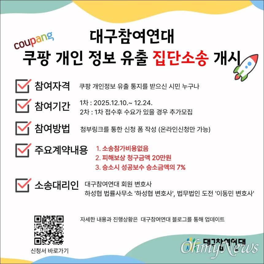 대구참여연대는 쿠팡의 진정한 사과와 엄중한 책임을 묻고 2차 피해방지와 소비자 보호 등을 위해 집단소송에 나서기로 하고 오는 24일까지 참가자 모집에 나선다고 밝혔다.