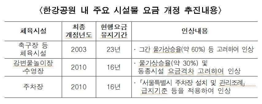 한강공원 시설 이용료는 항목별로 마지막 조정 시점이 오래됐다.서울시에 따르면 축구장 등 체육시설은 2003년 이후 23년간 요금 조정이 없었다.주차장과 강변물놀이장·수영장도 2010년 이후 16년간 동결된 상태다.
