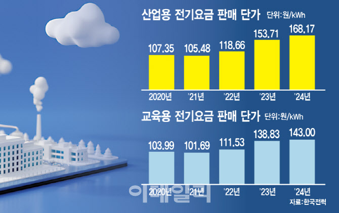 게다가 국내 산업용 전기요금 판매 단가는 가파르게 오르고 있다.지난해 말 판매 단가는 kWh(킬로와트시)당 168.17원으로,2021년(105.48원)보다 59.4% 올랐다.기업들에게는 큰 부담이다.