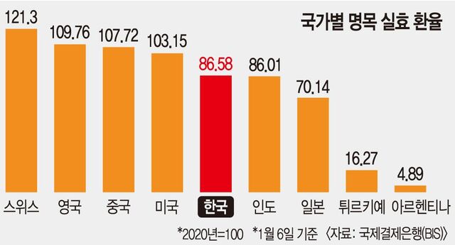 환율에 물가 수준까지 반영해 한 나라의 통화 구매력을 나타내는‘실질 실효 환율’(REER)을 보면 상황은 더 나쁘다.최근 발표치인 지난해 11월 말 기준 원화는 87.05를 기록해 금융위기 직후인 2009년 4월 말(85.47) 이후 가장 낮다.이 지표에서 원화는 일본(69.4) 다음으로 낮아 64개국 중 63위를 차지했다.