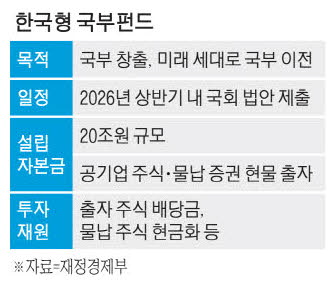 정부는 국부 창출을 올해 경제성장전략의 핵심 과제로 삼고 '한국형 국부펀드' 설립을 추진한다.상반기 중 관련 법안을 국회에 제출하고,이르면 하반기 출범을 목표로 하고 있다.
