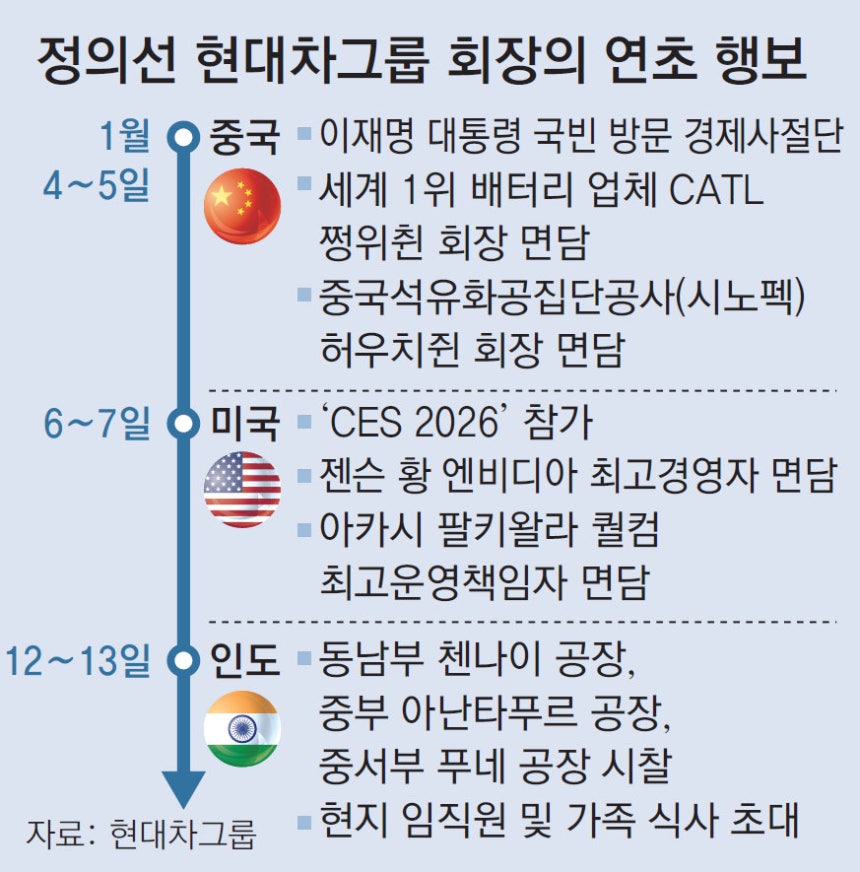 정의선 현대자동차그룹 회장이 새해 초부터 이들 3개국을 쉴 새 없이 방문하며‘수소 생태계‘자율주행’등 차세대 먹거리 구상에 나섰다.글로벌 리더 기업 대표들을 만나 협력 방안을 구상하는 한편 시장 상황도 직접 점검했다.