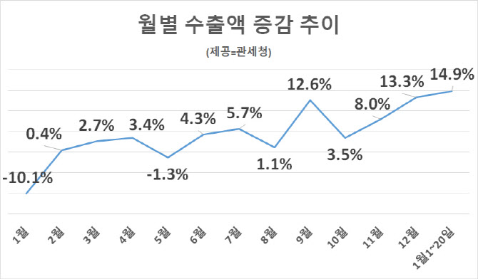 트럼프 관세 불확실성 우려는 여전[이데일리 김형욱 기자] 슈퍼사이클을 탄 반도체가 연초 들어서도 전년대비 70%대 수출 증가 흐름을 보였다.이에 힘입어 전체 수출도 14.9% 늘었다.